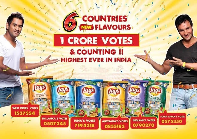 It was the 2011 cricket world cup, and Lays rolled out a bunch of flavors, each one representing a country. I remember running through the counter in a supermarket, looking at each country’s respective obesity-launchers. I saw that the Blue-colored ones are for India, and a new found sense of patriotism ran down my body. I saw the packet, stood up straight, and saluted proudly.